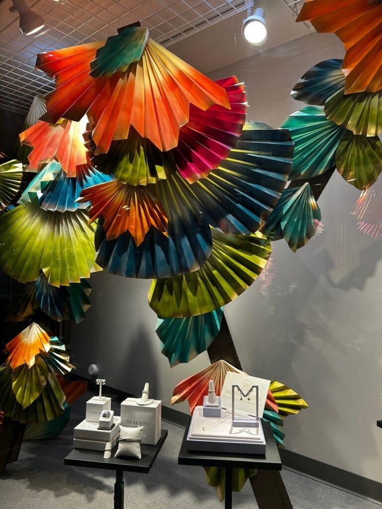 All successful displays have good composition. And good composition means less complication. And a less complicated display is easier for the human brain to process, and often less expensive to make. (Win! Win!) What do we mean by good composition? Think about your basic elements and principles of design. For instance, creating a triangle shape helps the eye focus at the top, then wander through the body of the triangle. Using one large single prop such as a gigantic paper flower or super-sized snowflake, can be super effective and attention-getting. It becomes the one and only focal point. Display in odd numbers, i.e.: three, five, or seven, as the visual rhythm of odd numbered objects is more visually pleasing. “Layering” your window is also a great form of composition as it serves to attract attention from a distance via a bright backdrop, then entices someone to come closer and look at the props in front of the backdrop, and finally up to the window to look at jewelry pieces.